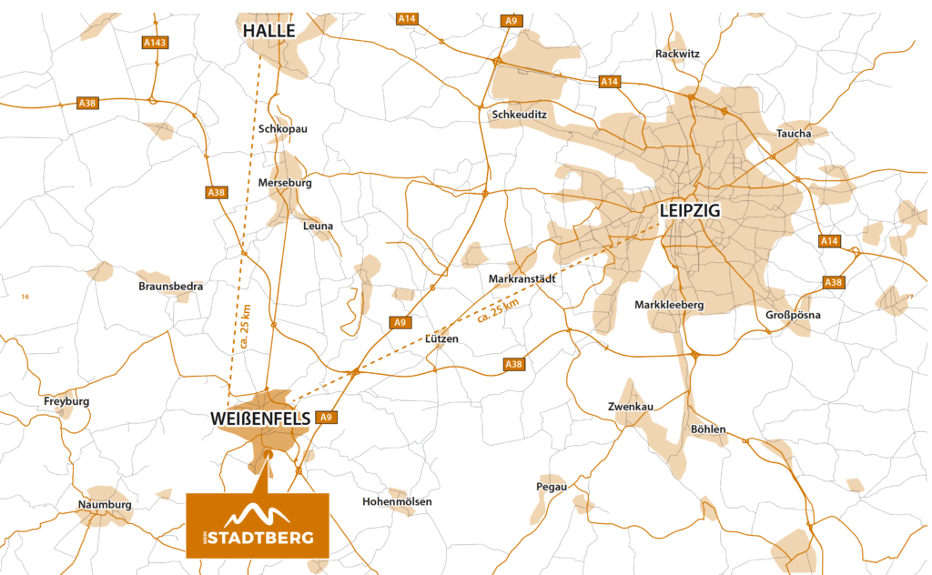Mit rund 40.000 Einwohnern ist Weißenfels an der Saale die einwohnerstärkste Stadt im Burgenlandkreis von Sachsen-Anhalt. Durch ihre Lage am Schnittpunkt der Bundesländer Sachsen-Anhalt, Sachsen und Thüringen besteht eine enge Verknüpfung mit Städten und Gemeinden in der Metropolregion Mitteldeutschland. Die nahe verlaufenden Autobahnen A9 und A38 ermöglichen eine zügige Erreichbarkeit von Leipzig, Halle und weiteren Zielen in Ost-West-Richtung. Der internationale Flughafen Leipzig-Halle ist beispielsweise in nur etwa 30 Minuten mit dem Auto erreichbar. Diese hervorragende Anbindung macht die Stadt zu einem attraktiven Wohnort – auch für Berufspendler.