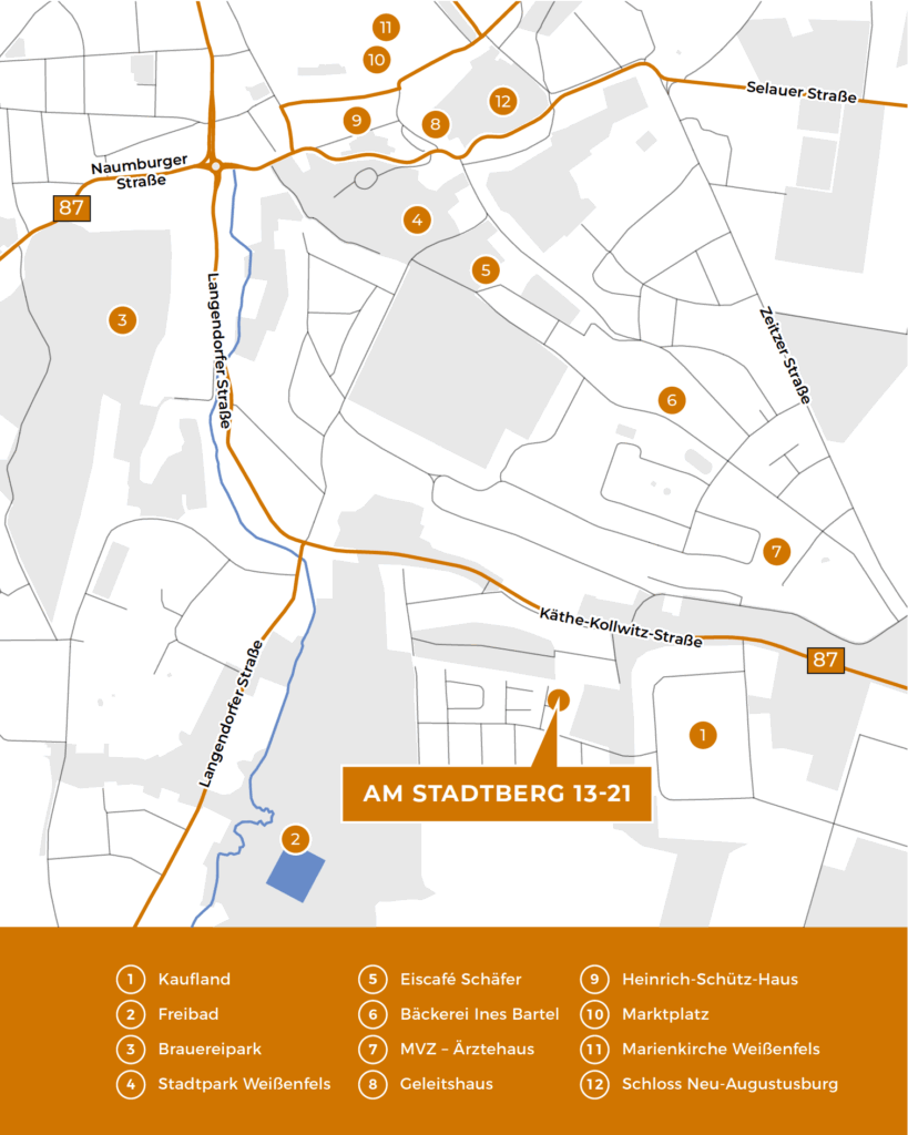 Der Standort unseres Objektes „MEIN STADTBERG“ befindet sich, wie der Name schon sagt, Am Stadtberg im Süden von Weißenfels. Im direkten Umfeld lassen sich viele Besorgungen des täglichen Bedarfs erledigen. In die Innenstadt gelangt man per Bus in nur wenigen Minuten. Für Fahrten in die Region, nach Leipzig oder Halle stehen die nahen Autobahnen zur Verfügung. Es gibt auch eine sehr gute Zuganbindung nach Leipzig, Jena oder Halle.